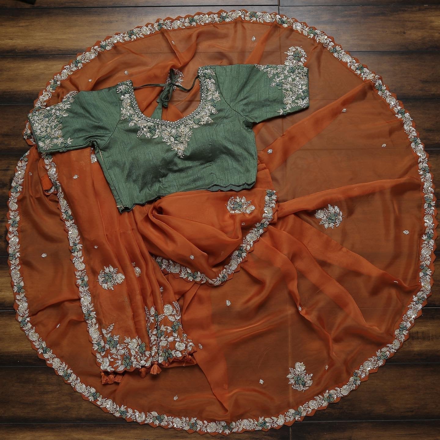 Composition: Sari and blouse length- 6.5 metres. Includes coordinated unstitched blouse piece