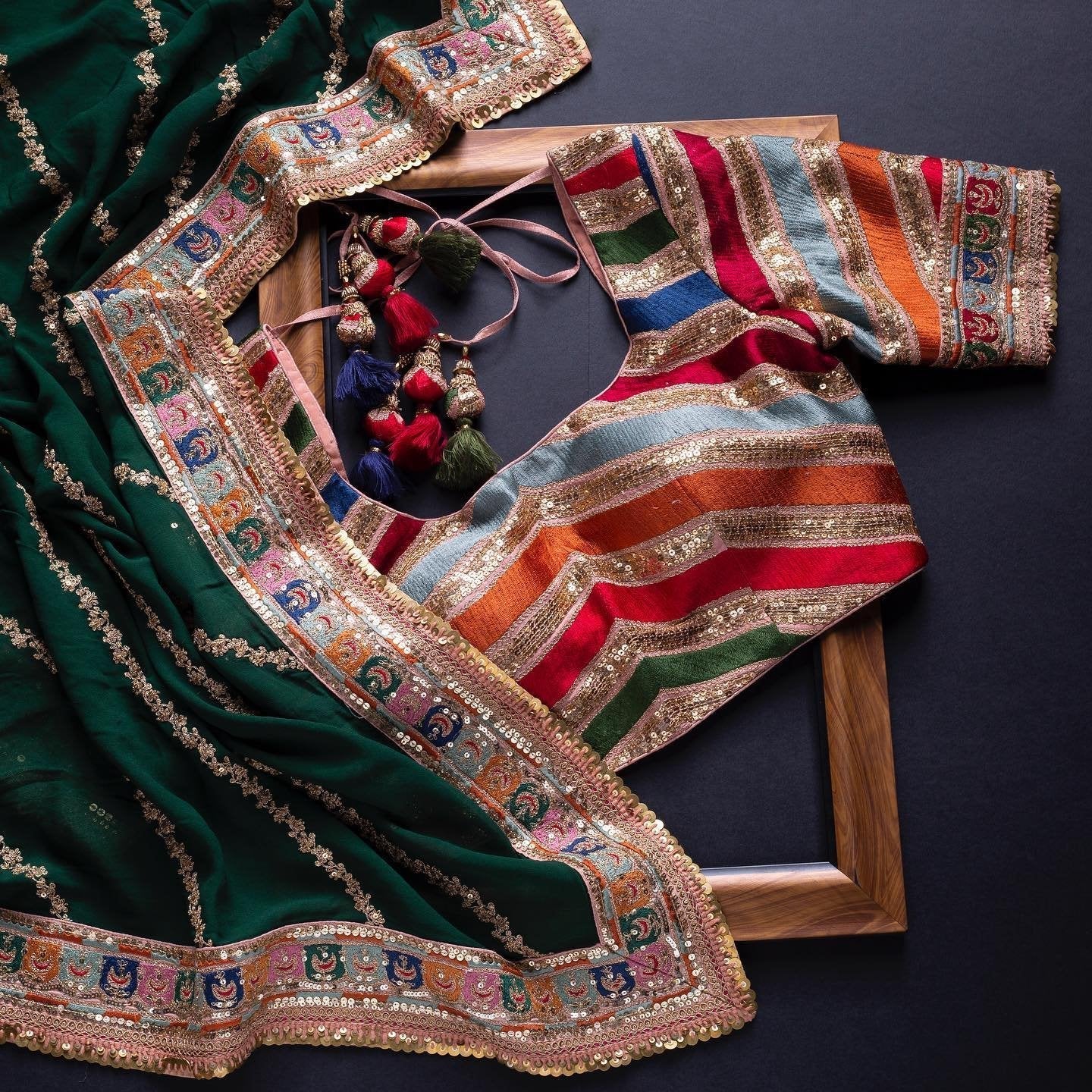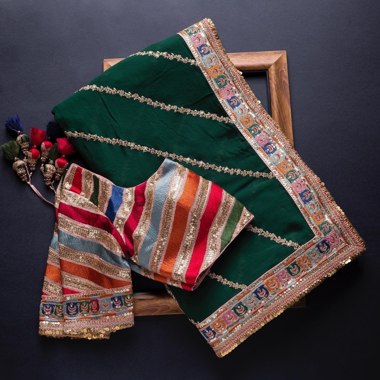 Composition: Sari and blouse length- 6.5 metres. Includes coordinated unstitched blouse piece