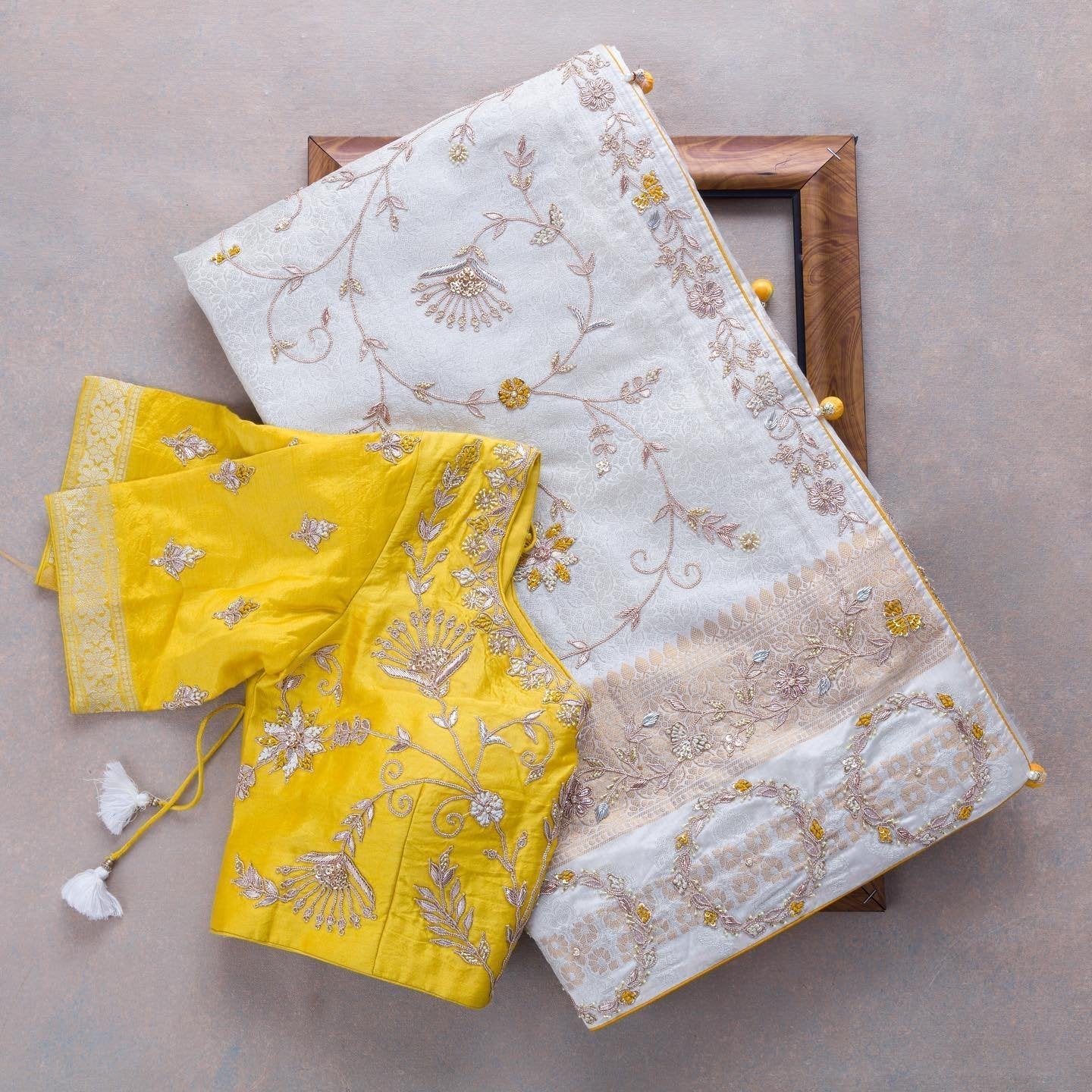 Composition: Sari and blouse length- 6.5 metres. Includes coordinated unstitched blouse piece