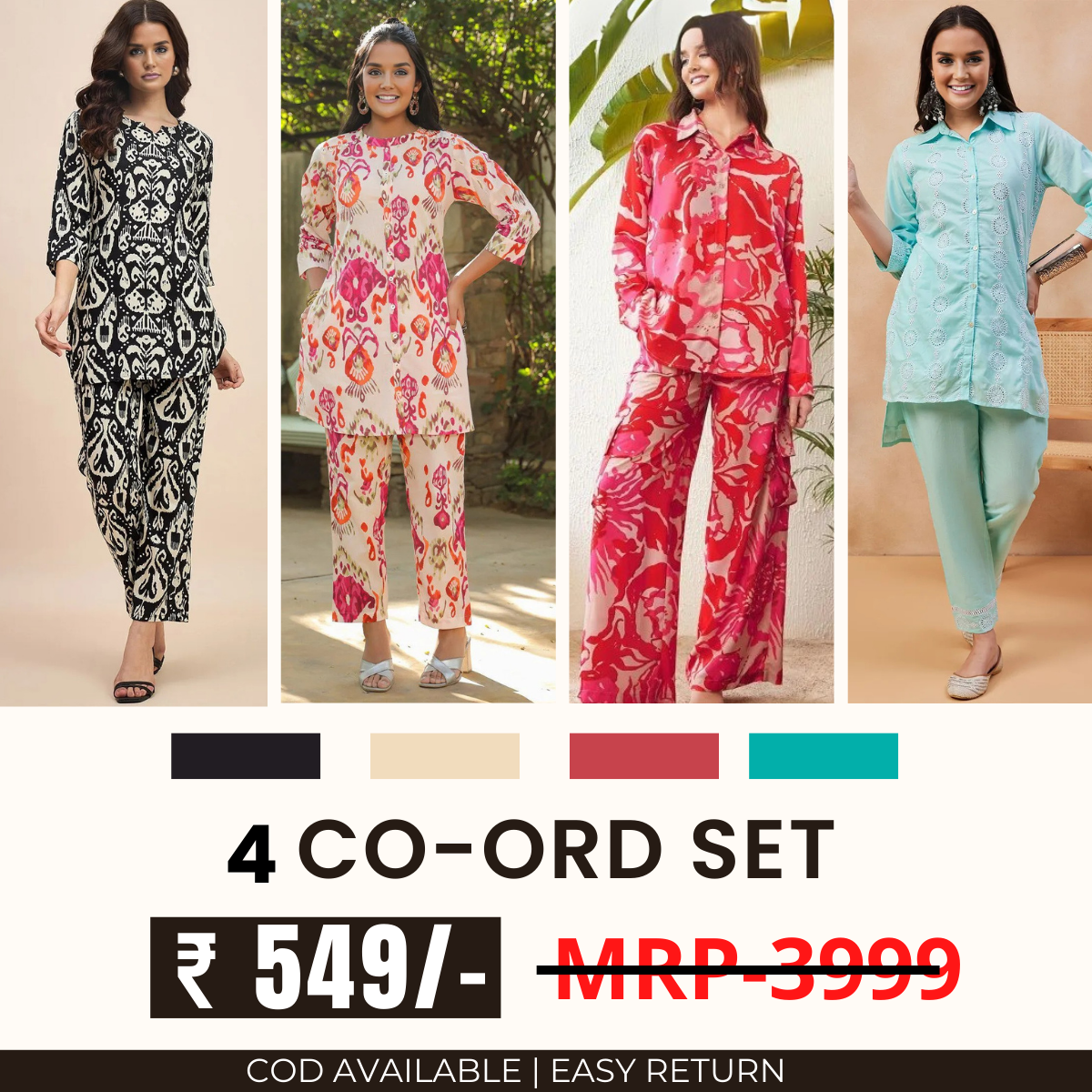 The 4 Co-ord Set Women Combo offers a versatile and stylish wardrobe upgrade for every occasion. This collection includes an elegant ethnic co-ord set, perfect for festive celebrations with its intricate prints and rich fabrics like silk or cotton in vibrant hues such as maroon or emerald green.