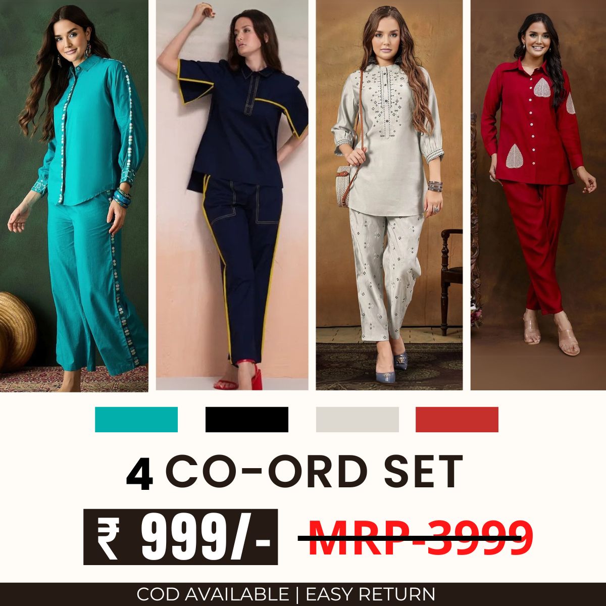 The 4 Co-ord Set Women Combo offers a versatile and stylish wardrobe upgrade for every occasion. This collection includes an elegant ethnic co-ord set, perfect for festive celebrations with its intricate prints and rich fabrics like silk or cotton in vibrant hues such as maroon or emerald green.